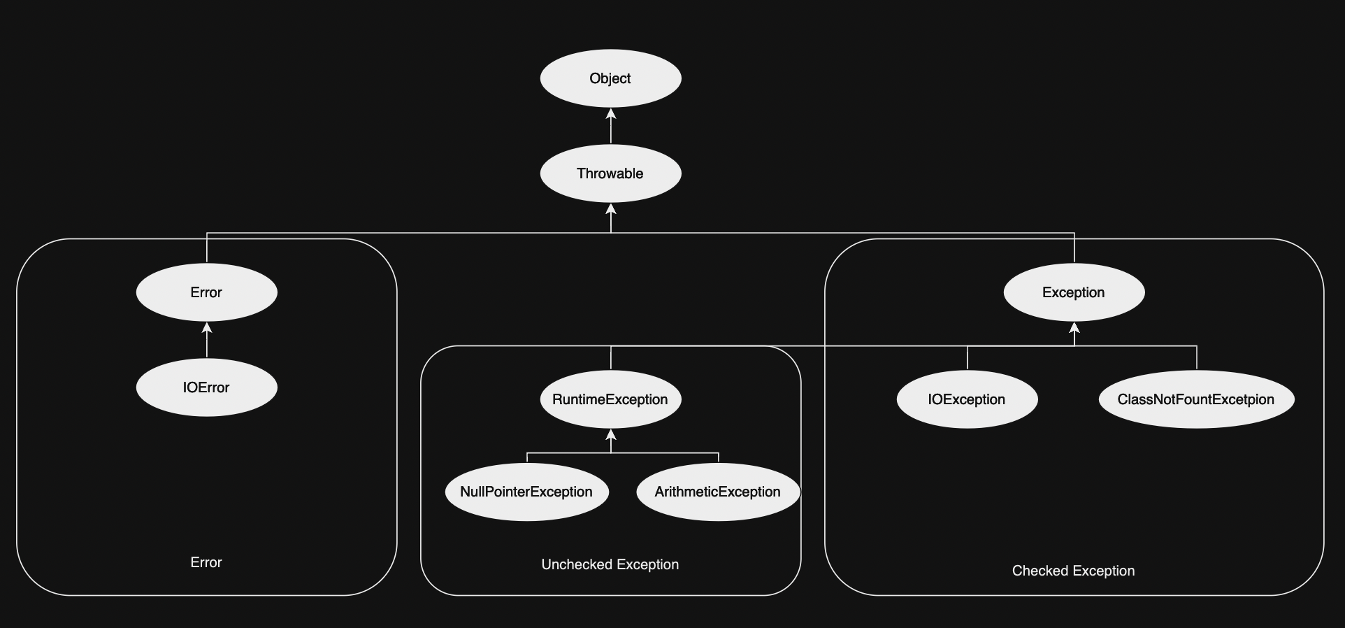 - RuntimeException → Exception 중 컴파일러가 예외를 체크하지 않으며, 실행 중 발생할 수 있고 예외 처리가 필수가 아니며, 언체크 예외라고도 불림.