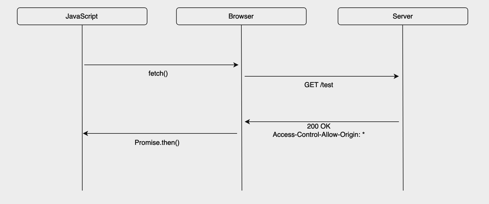 - 예비 요청(Preflight) 과정 없이 바로 서버에 본 요청을 한 후, 서버가 응답의 헤더에 Access-Control-Allow-Origin과 같은 값을 전송하면 브라우저가 서로 비교 후 CORS 정책 위반여부를 검사하는 방식.