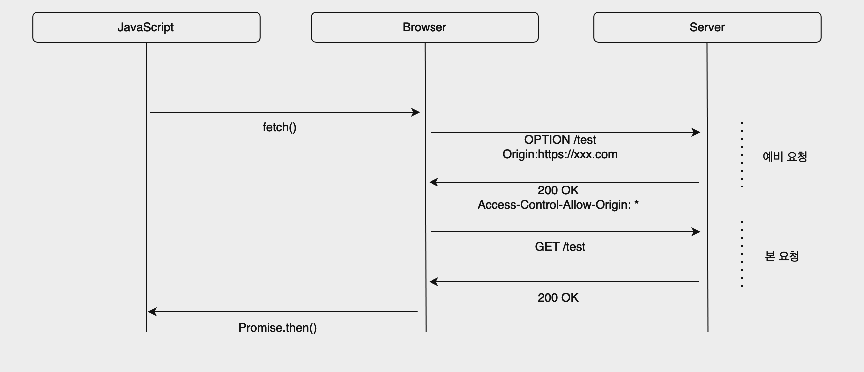 - 브라우저는 요청을 한 번에 보내지 않고 예비 요청과 본 요청을 나누어서 전달함. 이 때 보내는 예비 요청을 Preflight라고 하며 예비 요청의 HTTP Method는 OPTIONS가 사용