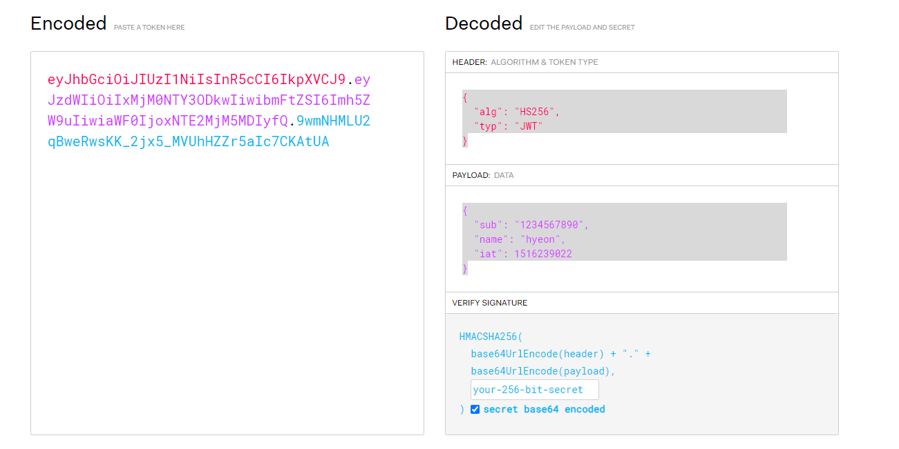 이 부분은 수정이 가능하고 노출이 가능하므로 ID와 비밀번호와 같은 개인 정보가 아닌 토큰의 만료 기간이나 발급 시간 등을 담아야 한다.