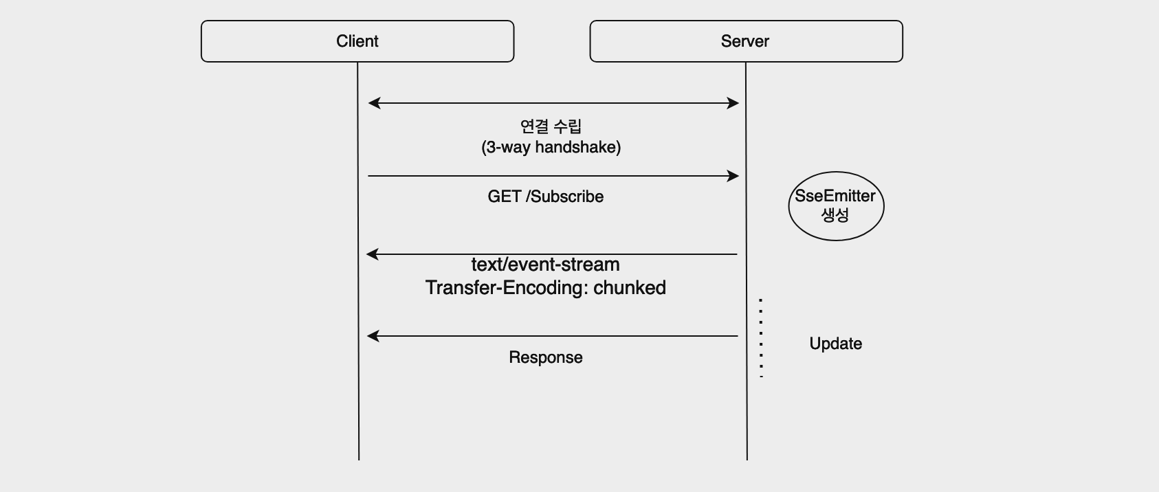 SSE는 서버가 클라이언트로 데이터를 실시간 푸시하는 방식으로, 클라이언트가 서버에 연결을 수립하고 특정 이벤트에 대한 구독 요청(Subscribe)을 보내면 서버는 해당 이벤트가 발생할 때마다 자동으로 데이터를 클라이언트에 전송한다.