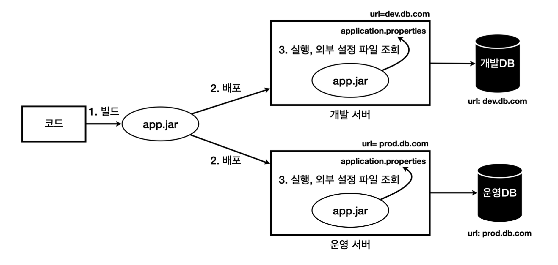 즉 환경에 따라 설정값이 달라지게 되는데, 각 환경에 맞게 설정값을 포함하고 jar로 빌드하여 배포하게 되면 빌드를 여러 번 진행해야 하고, 환경마다 빌드의 결과물이 달라 유연성이 떨어진다는 문제가 있다.