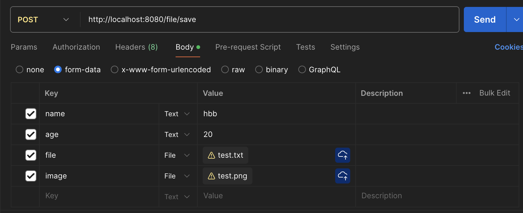 포스트맨을 이용해서 name,age,텍스트파일,이미지를 전송하였다.