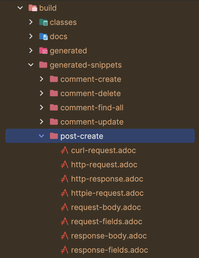 위와 같이 설정하면 test 이후 snippet이 /build/{build.grade에서 지정한 snippetsDir}/post-create 하위에 snippet이 생성된다.
