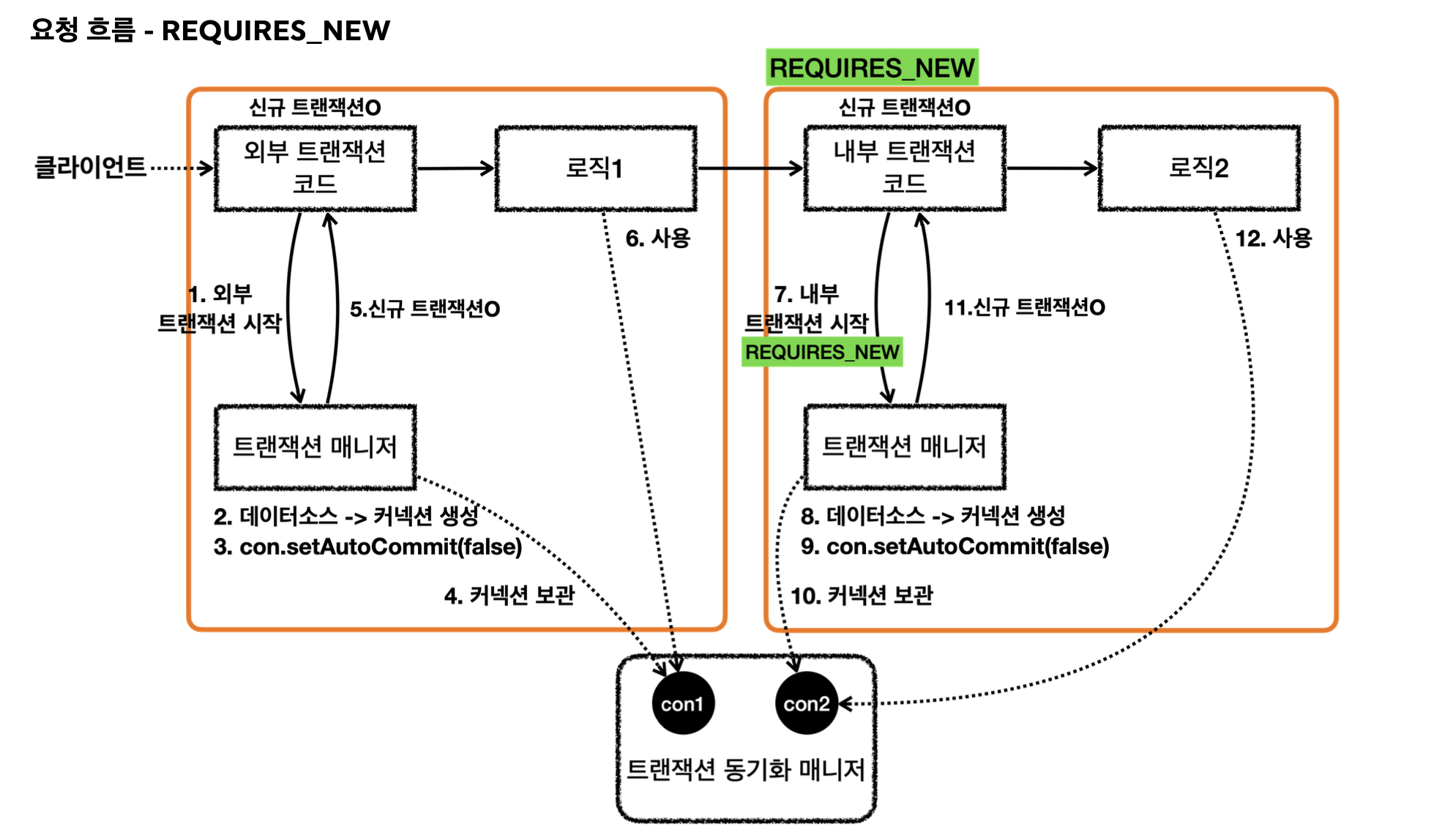 즉 REQUIRES_NEW 옵션으로 내부 트랜잭션을 시작하면 트랜잭션 매니저는 데이터소스를 통해 커넥션을 생성하고 생성한 커넥션을 수동 커밋으로로 설정하여 물리 트랜잭션 시작한다.