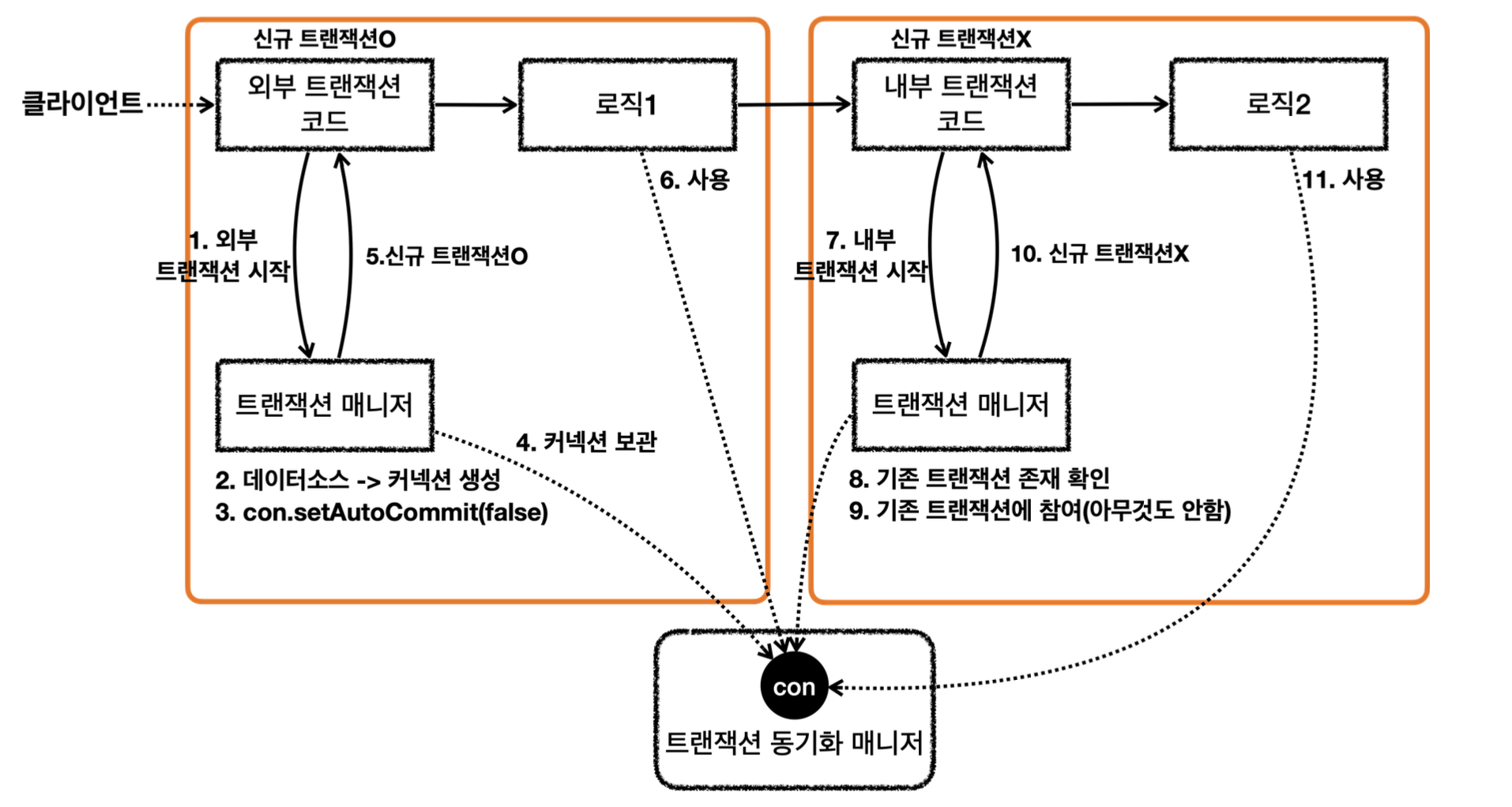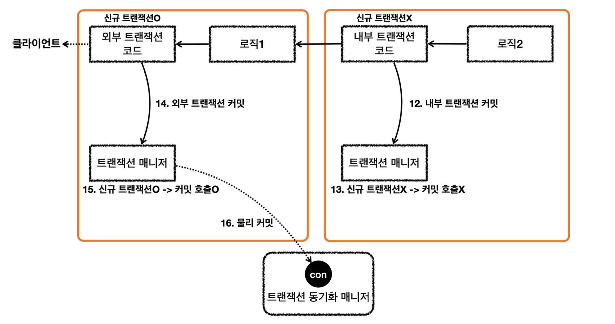 즉 내부 트랜잭션이 먼저 진행한 트랜잭션에 참여하여 외부와 내부 트랜잭션이 하나의 물리 트랜잭션으로 묶인다. 실질적으로 하나의 물리 트랜잭션이지만 내부에는 두 개의 논리 트랜잭션으로 나뉘어져있다.